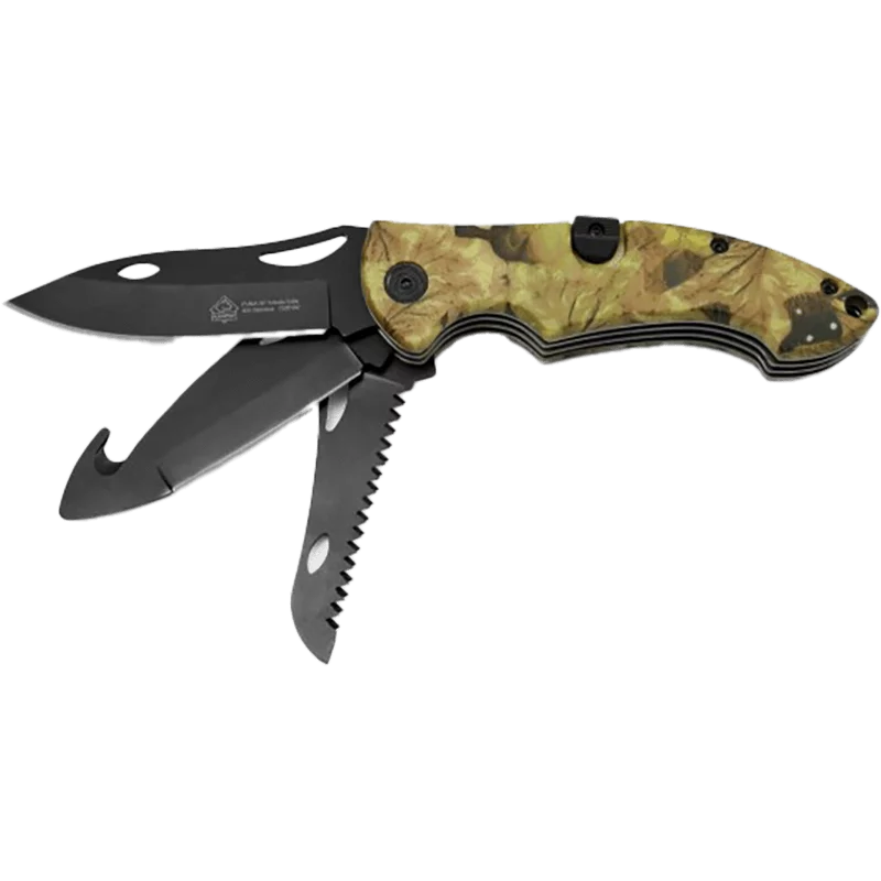 Das Trifecta aus unserer amerikanischen PUMA XP-Serie ist ein multifunktionales Jagdtaschenmesser mit drei verschiedenen Klingen aus beschichteten 420'er Stahl, gehärtet auf 55-57 HRC.