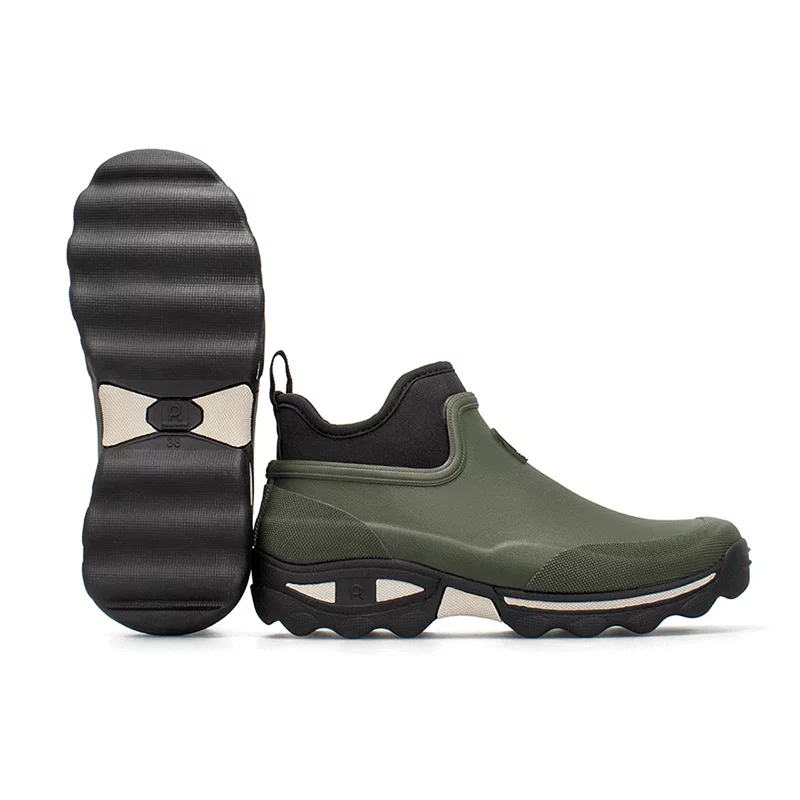 Die Gummistiefelette in der Farbe khaki ist aus Naturkautschuk und super robust. Die Sohle hat ein dickes Profil, welches das lange Tragen der Gummistiefeletten sehr angenehm macht.