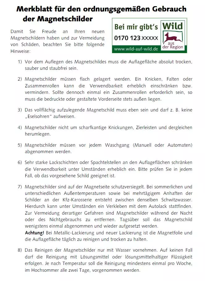 Zwei hochwertige Auto-Magnettafeln (für die rechte und linke Autotür) mit dem Slogan 'Bei mir gibt's Wild aus der Region', inklusive Ihrer Wunschrufnummer. Machen Sie auf der Fahrt zum Kunden oder ins Revier Werbung für Ihr Wildbret-Angebot. Die Magnettafeln haften auf Fahrer- und Beifahrertür (laut Hersteller bis 200 km/h) und sind leicht wieder abnehmbar.