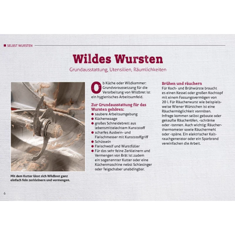 Von mediterraner Wildbratwurst über Sülzwurst bis hin zur Wildschwein-Weißwurst, in der Broschüre werden acht ansprechende Rezepte ausführlich vorgestellt. Auf insgesamt 32 Seiten im DIN-A5-Format gibt es zudem praktische Tipps für den Einstieg ins wilde Wursten – etwa zu unterschiedlichen Därmen sowie Räuchern, Pökeln