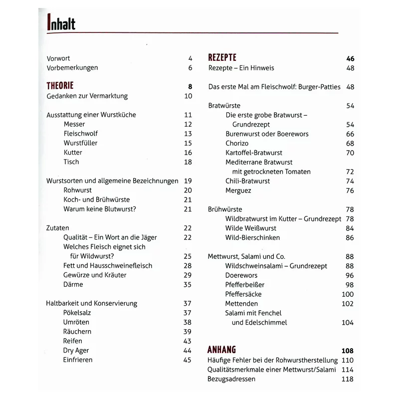 Es werden die wichtigen Wurstsorten, wie Bratwürste, Pfefferbeißer, Mettwurst und Salami behandelt. Jäger erzielen mehr für das Wildbret, wenn er es zu Wurst, Schinken und Trockenfleisch verarbeitet wird, aber auch wenn das Fleisch zugekauft wird, tut dies dem Spaß und dem Geschmackserlebnis einer eigenen Wurst keinen Abbruch.