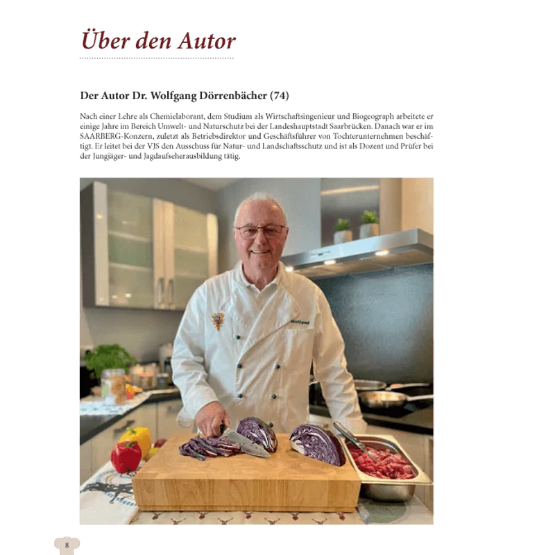Autor Dr. Wolfgang Dörrenbächer, Mitglied im Vorstand des saarländischen Jagdverbandes, ist seit vielen Jahren begeisterter Amateurkoch und Leiter von Wildkochkursen. Er hat seine praktischen Erfahrungen als Jäger, sein Wissen als Biogeograph gepaart mit der Liebe zur heimischen Küche in dieses wunderschöne Kochbuch „saarländische Jägerküche II“ umgesetzt.