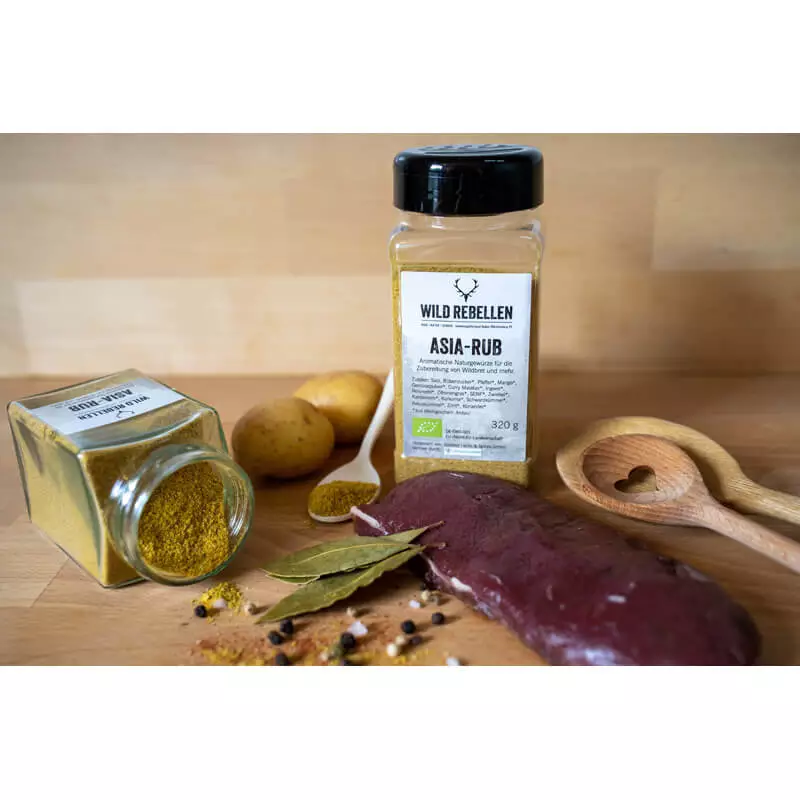 Dry-Rubs – aromatische Naturgewürze für die Zubereitung von Wildfleisch: Spice up your Wild! Wild auf dem Grill ist absolut im Trend. Anstatt das edle Fleisch in Marinaden zu ertränken, empfiehlt es sich, das Fleisch kurz vor dem Grillen mit sogenannten Dry-Rubs einzureiben. Durch die spezielle Zusammensetzung der Rubs wird so das Grillgut nicht nur aromatisiert, sondern außen schön knusprig und innen zart. Auch für Pfannengerichte und Eintöpfe oder zum Herstellen von Würzpasten und Saucen sind die Gewürzkompositionen bestens geeignet. Die WildRebellen haben gemeinsam mit der Gewürzmanufaktur ECOLAND Herbs & Spices aus Wolpertshausen ihre eigenen Dry-Rubs kreiert. Diese wurden zwar speziell für die Verwendung mit Wildbret entwickelt, eignen sich aber auch für alles andere Fleisch. Die Rubs sind aus Gewürzen bester Qualität hergestellt worden und sehr ergiebig. Es gibt zwei unterschiedliche Geschmacksrichtungen: WILD-Rub ASIA-RUB WILD-Rub ist mediterran abgeschmeckt und bringt eine angenehme Schärfe mit ins Spiel Besonders geeignet für dunkles Fleisch. Zutaten: Salz, Rohrohrzucker*, Pfeffer*, Paprika*, Zwiebel*, Knoblauch*, Rote Bete*, Piment*, Nelken*, Kreuzkümmel*, Wacholderbeeren*, Thymian*, Rosmarin*, Chilli*, Lorbeer* * aus ökologischem Anbau ASIA-Rub hat eine sehr exotische Aromatik und spielt mit einer leichten Schärfe und Süße. Er schmeckt besonders gut in leichten Fleischgerichten und Geflügel. Zutaten: Salz, Rübenzucker*, Pfeffer*, Mango*, Gemüsepulver*, Curry Malabar*, Ingwer*, Reismehl*, Zitronengras*, Senf*, Zwiebel*, Kardamon*, Kurkuma*, Schwarzkümmel*, Kreuzkümmel*, Zimt*, Koriander* * aus ökologischem Anbau Verpackungseinheiten: im Glas mit 150 g in der Streudose mit 320 g